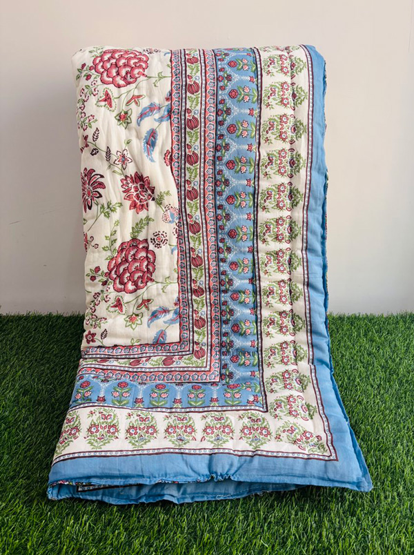 This elegant Jaipuri quilt is perfect for summer and mild winters, featuring floral prints with a soft jaal print against a blue base. Additionally, it is reversible, revealing a blue back print with a minimal pattern for a subtle and charming design. Handcrafted using ultra-soft “Mulmul” fabric and filled with cotton for superior comfort, it ensures a cozy night’s sleep. The handwoven stitching adds durability to the quilt, making it a reliable choice. This Jaipuri razai quilt is reversible, single bed size, and versatile enough for year-round use. Known for its incredible lightweight feel, softness, and warmth, it’s an ideal choice for all seasons.
