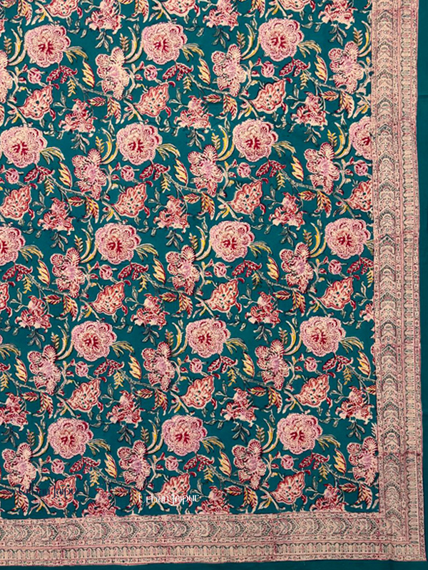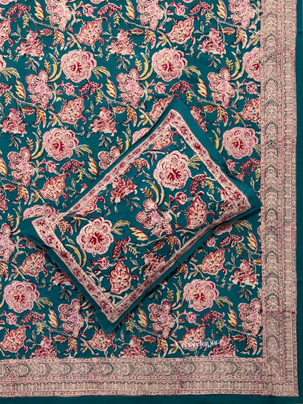 Bring home the elegance of Rajasthan with our hand block printed cotton bedsheet in a soothing blue base and cream border. Crafted from 100% pure cotton, this king size bedsheet (108×108 inches) features red floral motifs that add a touch of traditional charm and comfort to your bedroom.
