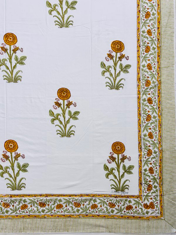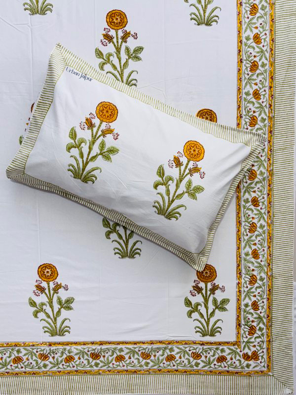Enhance your bedroom décor with our exquisite King Size Bedsheet, featuring a beautiful yellow floral hand block print design. Crafted from premium 300 TC percale cotton, this bedsheet offers both style and comfort. Measuring 108×108 inches, it includes two matching pillow covers to complete the look. The intricate yellow floral motifs on a crisp white base create a serene and elegant ambiance, making it perfect for any bedroom. Enjoy the soft, breathable comfort of fine cotton percale weave, ensuring a luxurious sleep experience.