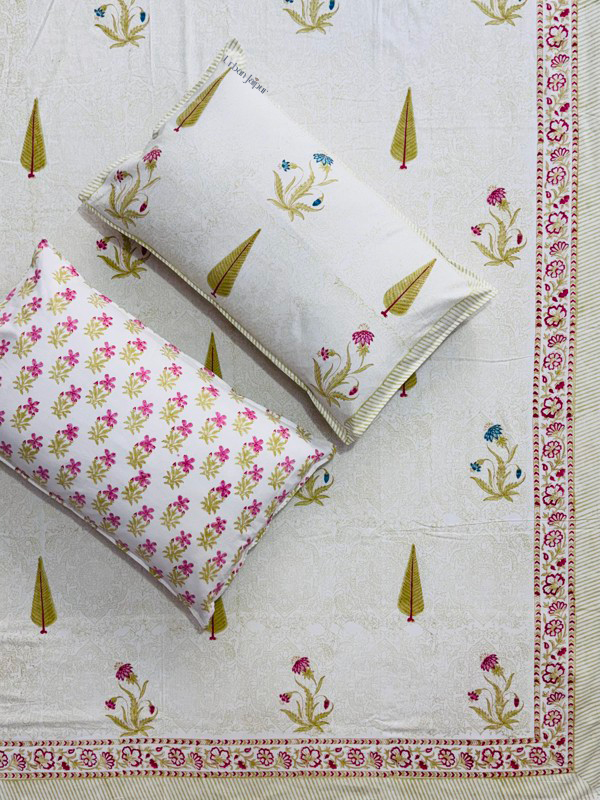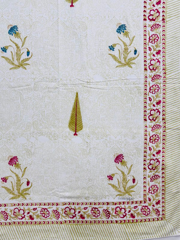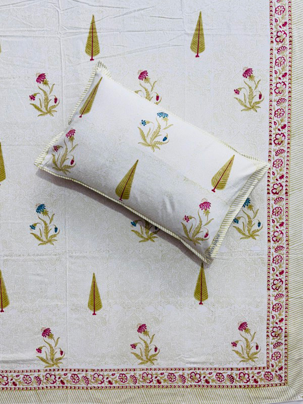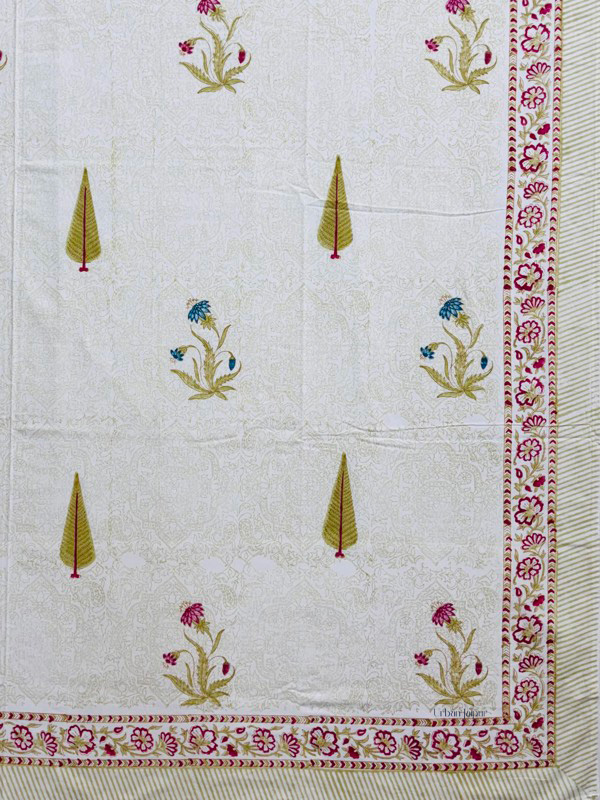 Upgrade your bedroom décor with this premium pure cotton King Size bedsheet, crafted on a soft cream dye base and hand block printed with a beautiful mix of green cypress motifs and red floral designs. Ideal for those who value quality bedding, this bedsheet offers a smooth feel, breathable comfort, and long-lasting durability — perfect for everyday use.