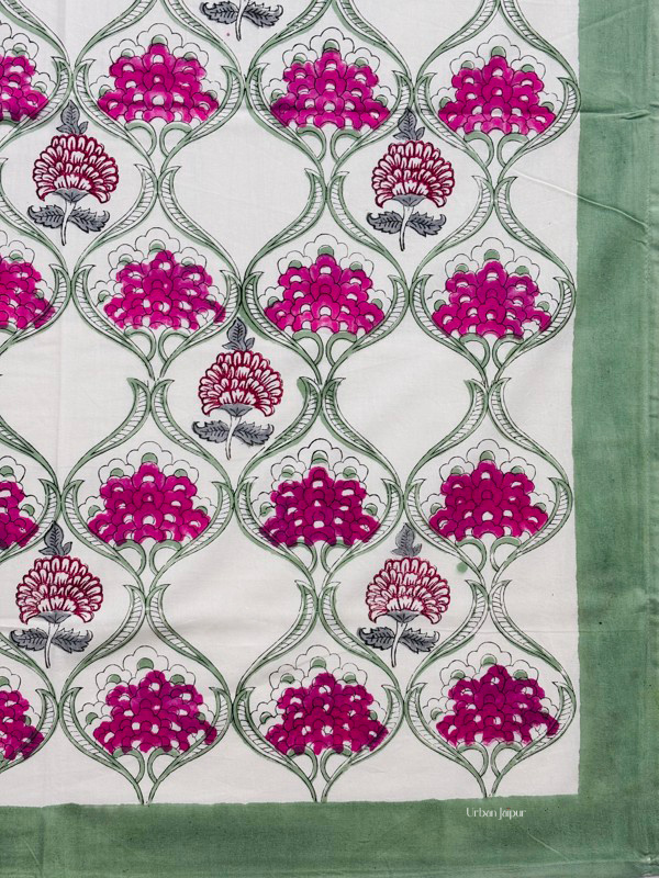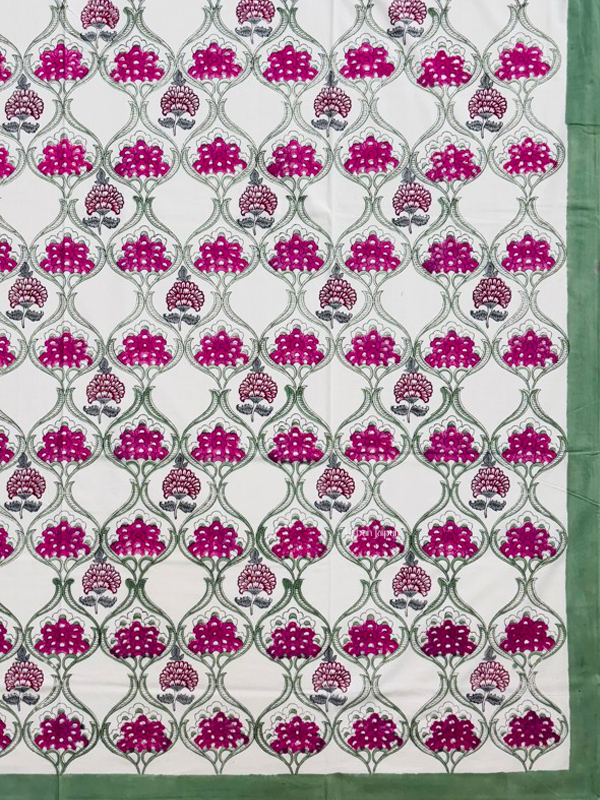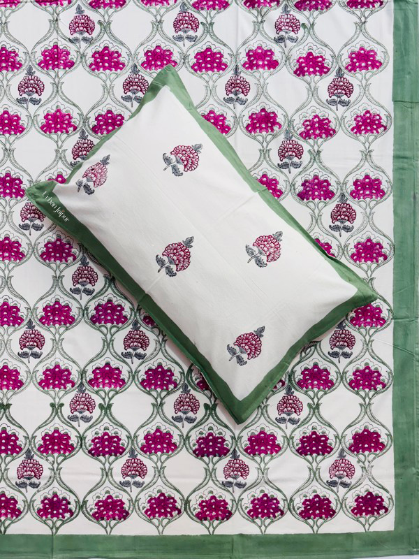 Add a touch of traditional elegance to your home with this pure cotton King Size bedsheet, featuring a crisp white base decorated with an intricate pink lotus jaal pattern. Each jaal is detailed with beautifully hand-printed lotus motifs, giving the bedsheet a graceful and artistic appeal.
