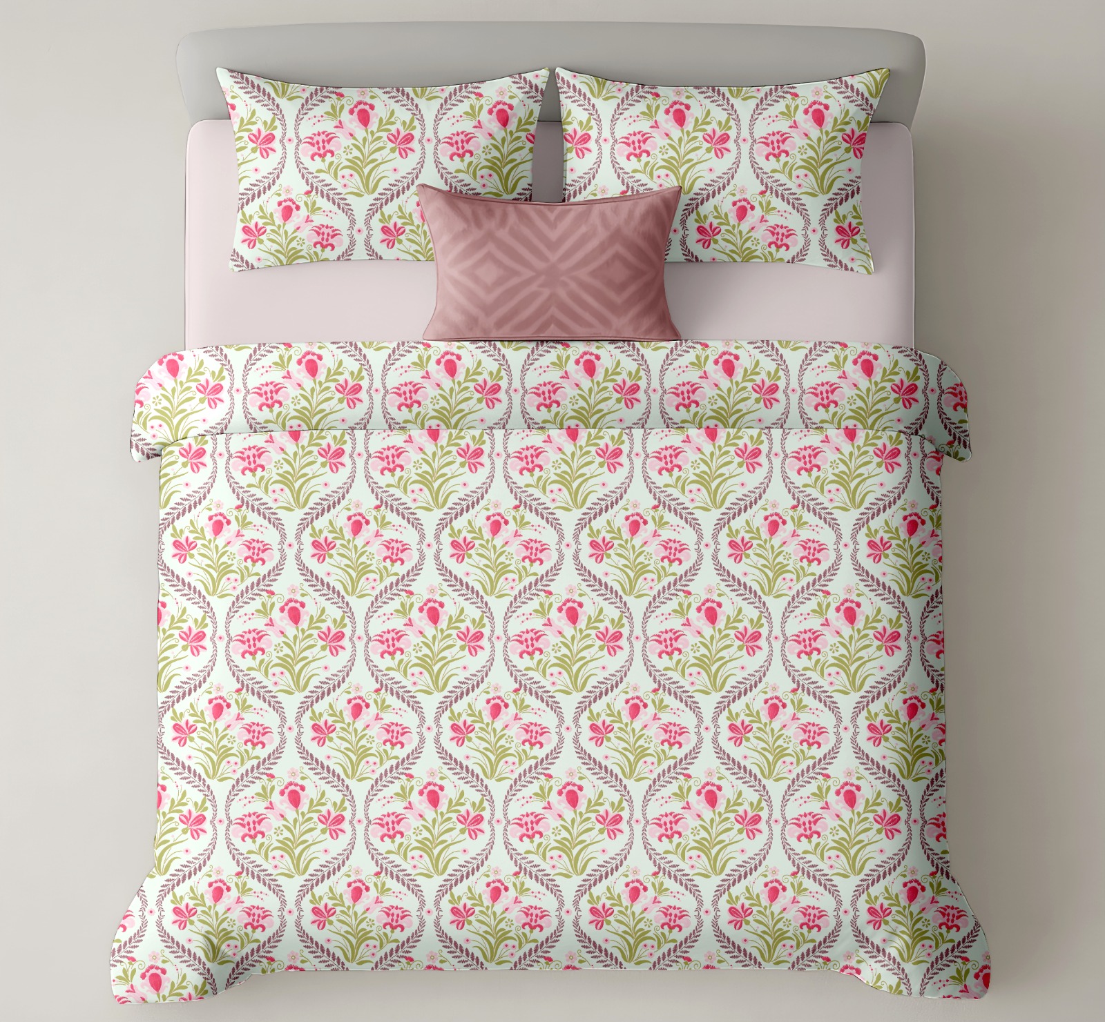 Add a refreshing touch of charm to your bedroom with our Light Green & Pink Floral Jaal Bedsheet from the Heritage 300 TC Collection. The soothing green base paired with delicate pink floral motifs creates a soft, inviting look perfect for modern homes with a traditional soul.