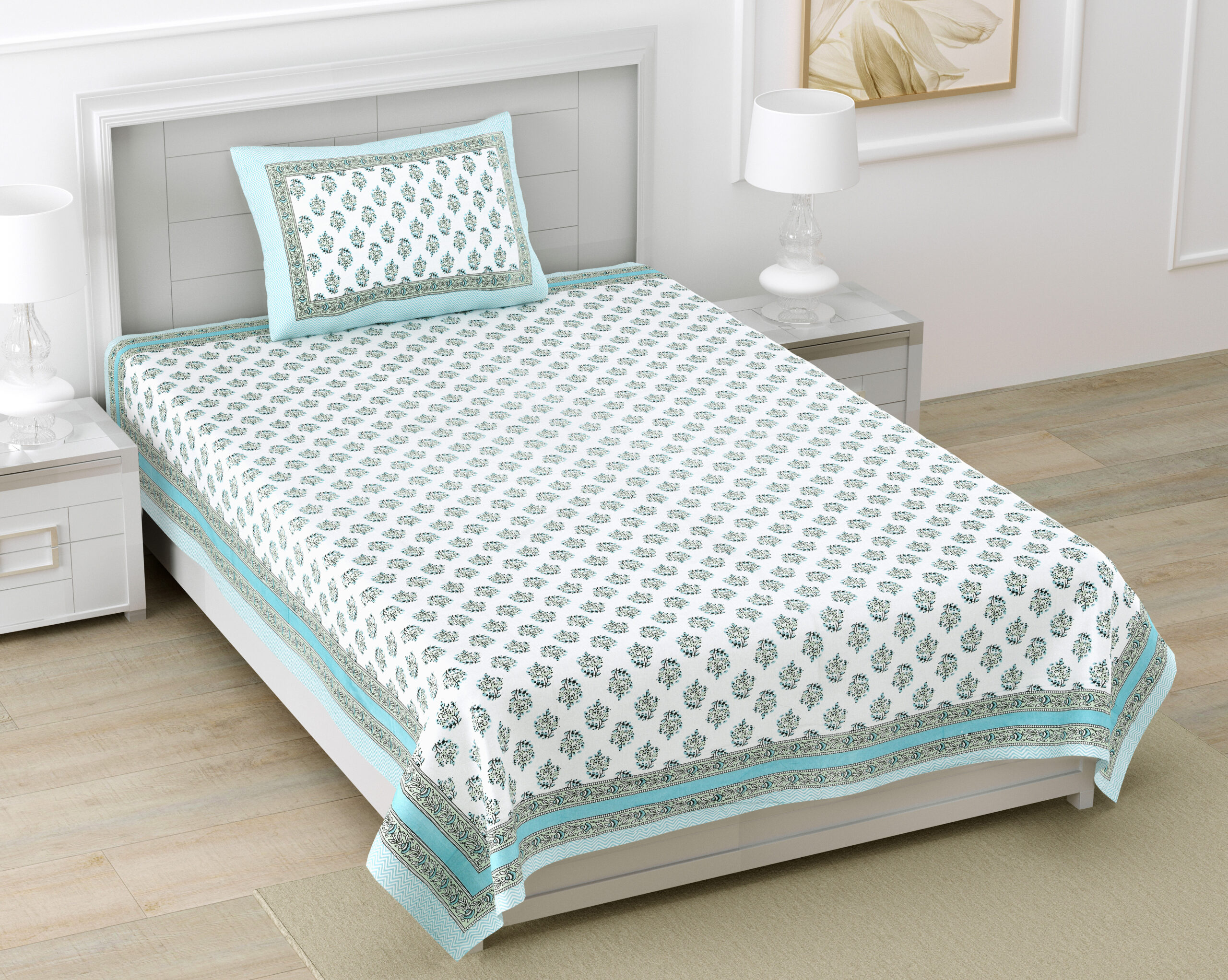 Wrap yourself in the beauty of traditional Jaipuri craftsmanship with our Ethnic Jaipuri Single Cotton Bedsheet. Featuring a delightful floral Jaipuri print in a refreshing green motifs and white color base, this soft cotton bedsheet promises comfort and style. Accompanied by one pillow cover, it’s sized at 60*90 for a snug fit. Add a touch of ethnic elegance to your bedroom decor!