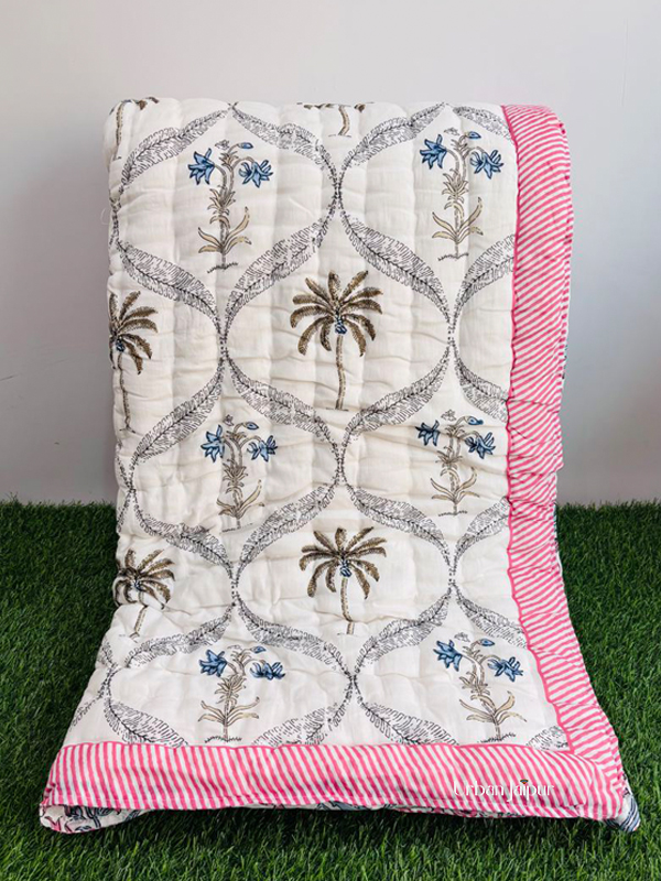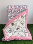 The design features a soothing white base adorned with blue and grey palm tree and floral motifs, creating a calm, elegant aesthetic. The reversible side showcases delicate pink and grey motifs spread evenly across the surface, giving you a fresh, versatile look every time you flip it. A broad pink border with an intricate lining pattern beautifully frames the quilt, adding a touch of contrast and luxury.