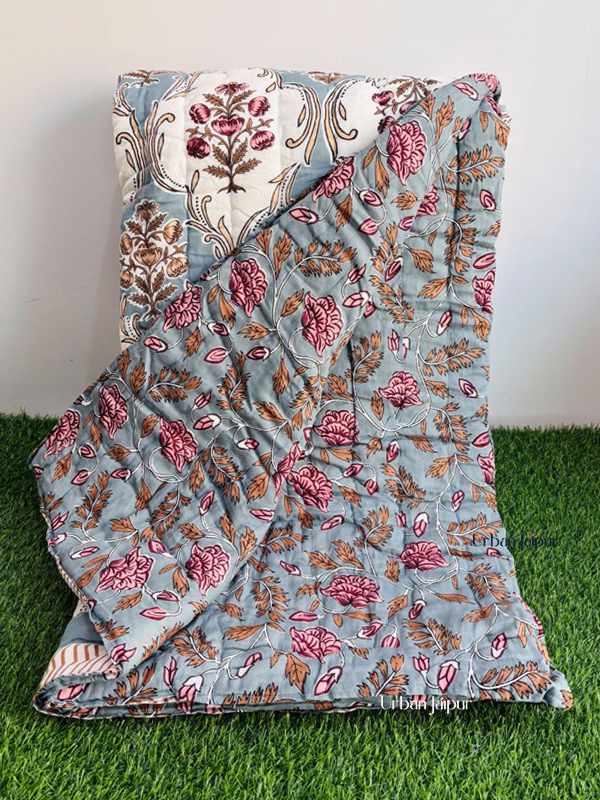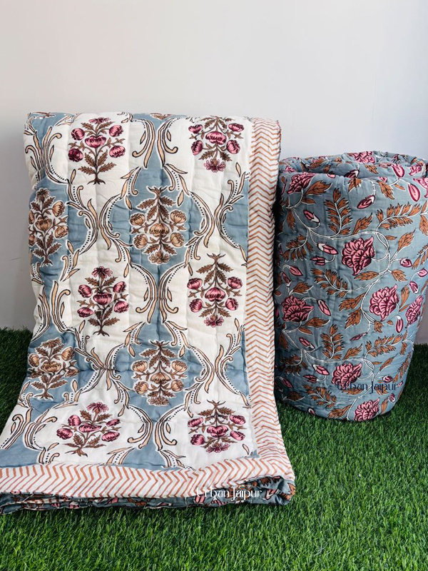 Give your bedroom a touch of understated elegance with this Jaipuri razai in a soft grey base, adorned with a detailed Mughal floral jaal. The design is created using traditional hand screen printing techniques, showcasing a reversible pattern with graceful blue and green floral motifs on both sides. Crafted from 100% pure cotton fabric and filled with soft cotton, this king-size quilt feels light, airy, and warm — ideal for light to moderate winters. For added warmth during colder months, choose the extra filling variant. Handcrafted with care in Jaipur, this Jaipuri razai brings together timeless design, cozy comfort, and everyday luxury.