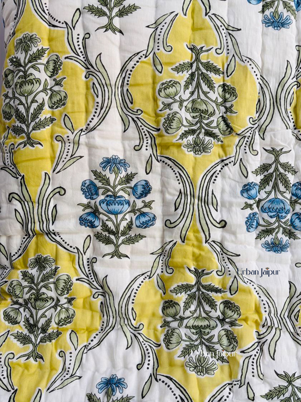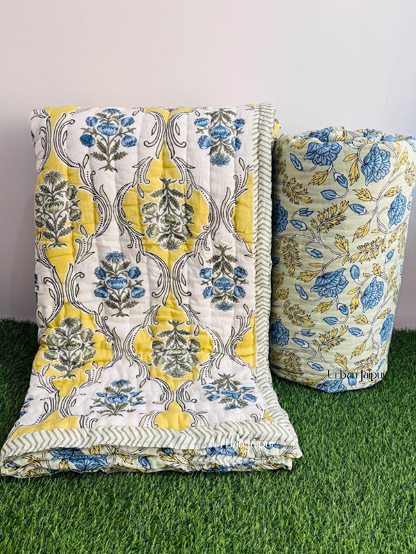 This Jaipuri razai in a rich green base features an intricate Mughal floral jaal design, handcrafted using traditional hand screen printing techniques. The reversible pattern showcases soft blue and green floral motifs all over, adding a refreshing touch to your bedding. Made from 100% pure cotton fabric with a soft cotton filling, this king-size Jaipuri quilt is lightweight, breathable, and warm — perfect for light to moderate winters. For colder weather, you can go for the extra filling variant for added warmth and comfort. Experience the beauty of authentic Jaipur craftsmanship with this soft, cozy, and timeless Jaipuri razai.