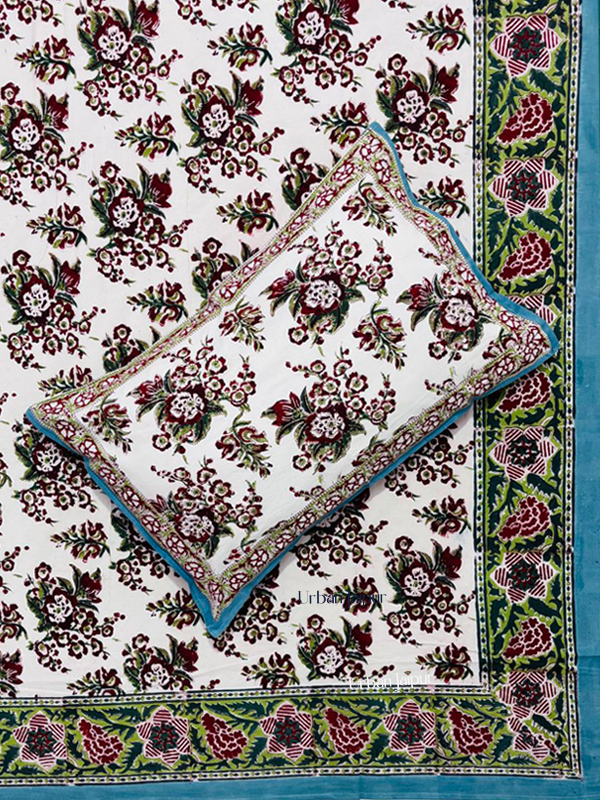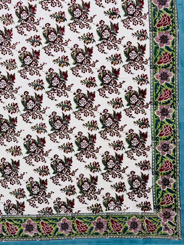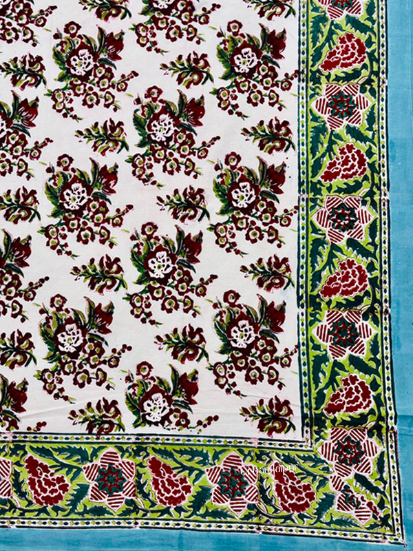 Brighten up your bedroom with this elegant Jaipuri hand block printed cotton bedsheet, featuring a white base adorned with colorful floral motifs and a beautiful green-blue border. Crafted from 100% pure cotton, this king size bedsheet (108×108 inches) offers softness, comfort, and timeless artisan charm.