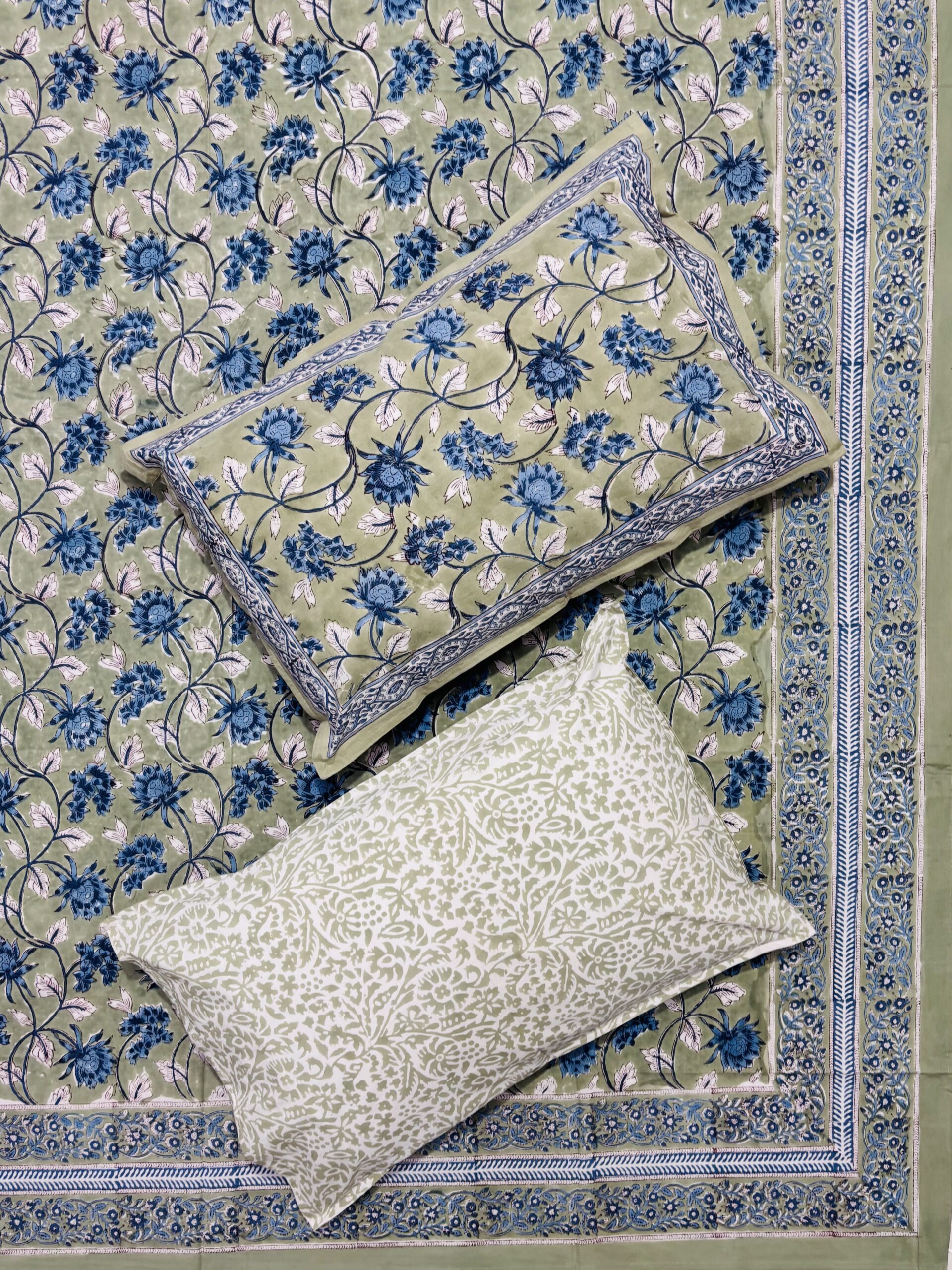Inspired by the calm hues of nature, this Karigari Handcrafted Cotton Bedsheet brings effortless grace to your space. The sage green base paired with soft blue floral motifs creates a soothing, timeless look that’s both minimal and artistic.