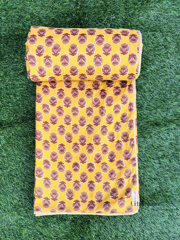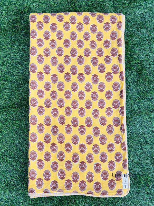 Brighten up your bedroom with this beautifully handcrafted mulmul cotton dohar. The front side features a cheerful yellow base adorned with delicate white boota motifs highlighted in pink, while the reverse side has a soft cream base with a subtle print for a soothing contrast.