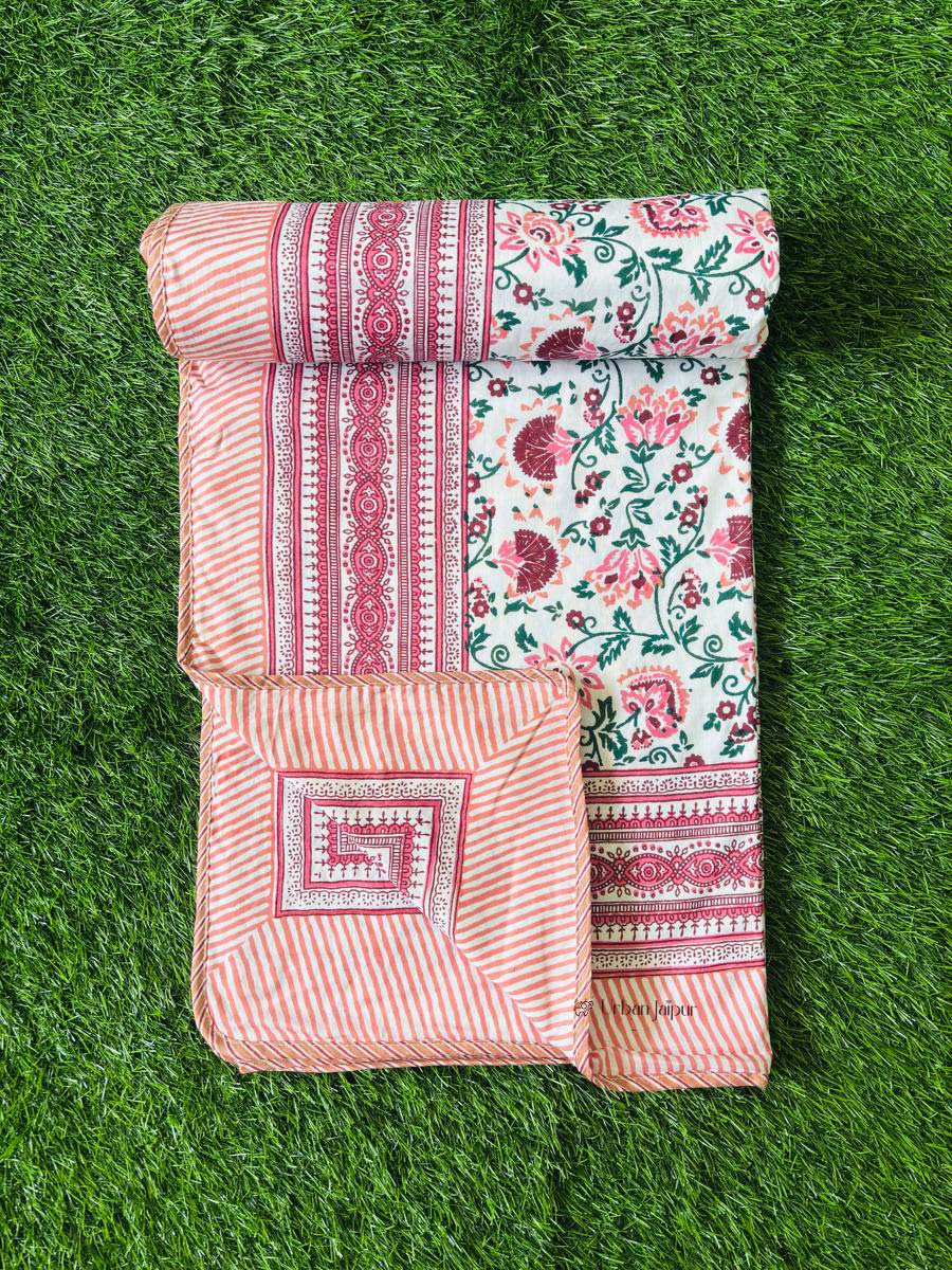 Brighten up your space with the fresh charm of our Blooming Pink Floral Dohar, designed in a vibrant multicolor palette. Made from 100% soft cotton, this lightweight dohar features a lively pink floral print on the front and a reversible subtle print on the back, offering two delightful looks in one.
