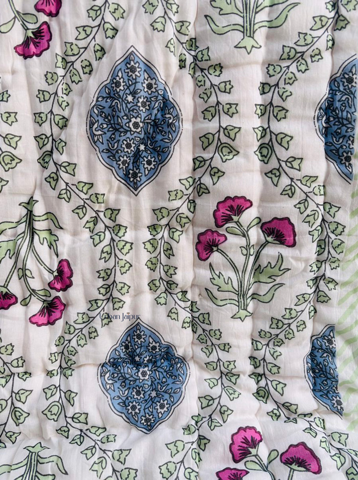Crafted with ultra-soft “Mulmul” fabric and filled with 100% cotton, it provides exceptional warmth while remaining lightweight. The reversible design adds versatility, with a subtle complementary pattern on the back. Perfect for enhancing your bedroom décor, this razai offers both style and functionality for year-round comfort.