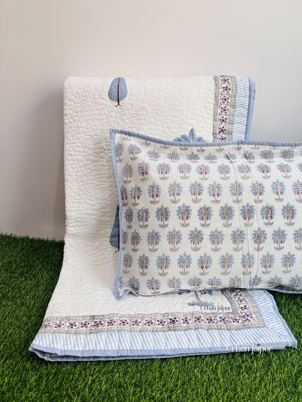 Bring a refreshing tropical vibe to your bedroom with the Tropical Breeze bedcover. Hand block printed and finely quilted, this king-size bedcover comes with two matching quilted pillow covers for a complete, coordinated look. The design showcases elegant palm trees in soothing blue and grey tones, adding a calm and breezy feel to your bed. Made from pure cotton, it’s soft, breathable, and durable, with non-fading dyes that keep it vibrant for years. Lightweight and versatile, it can be layered as a blanket or simply used to enhance your bed with color and texture.