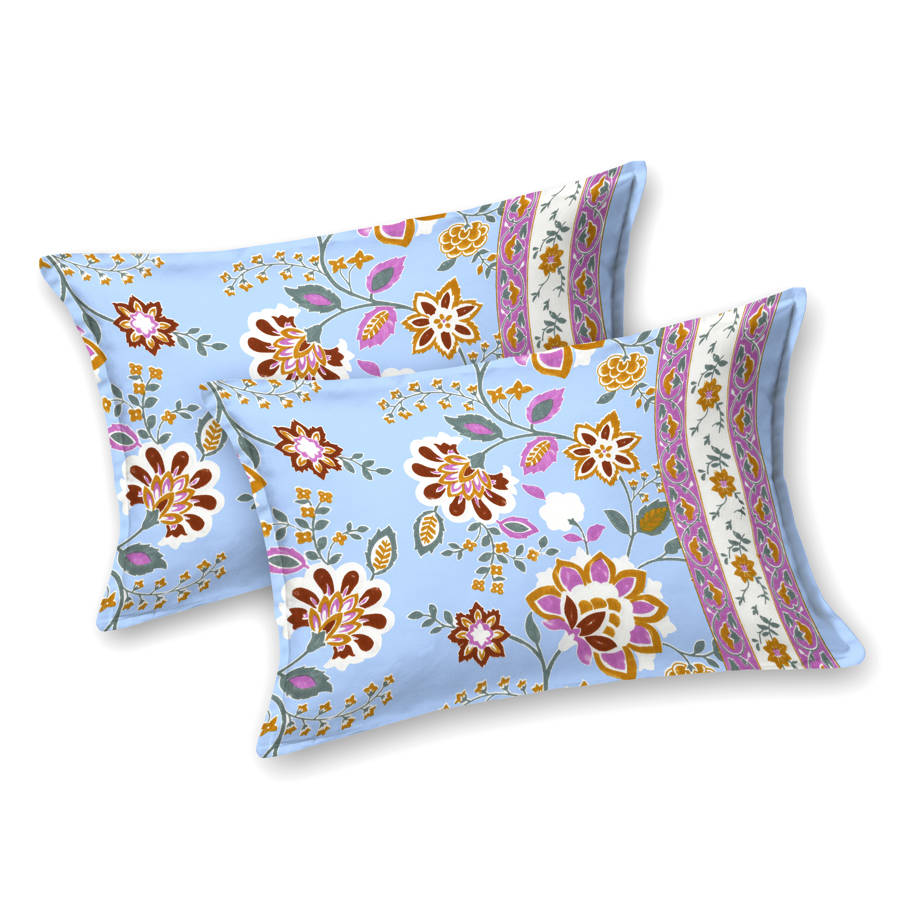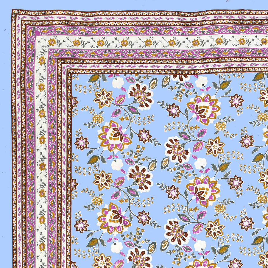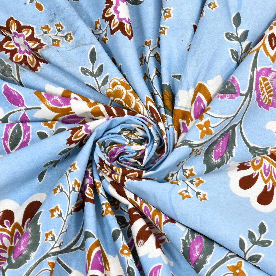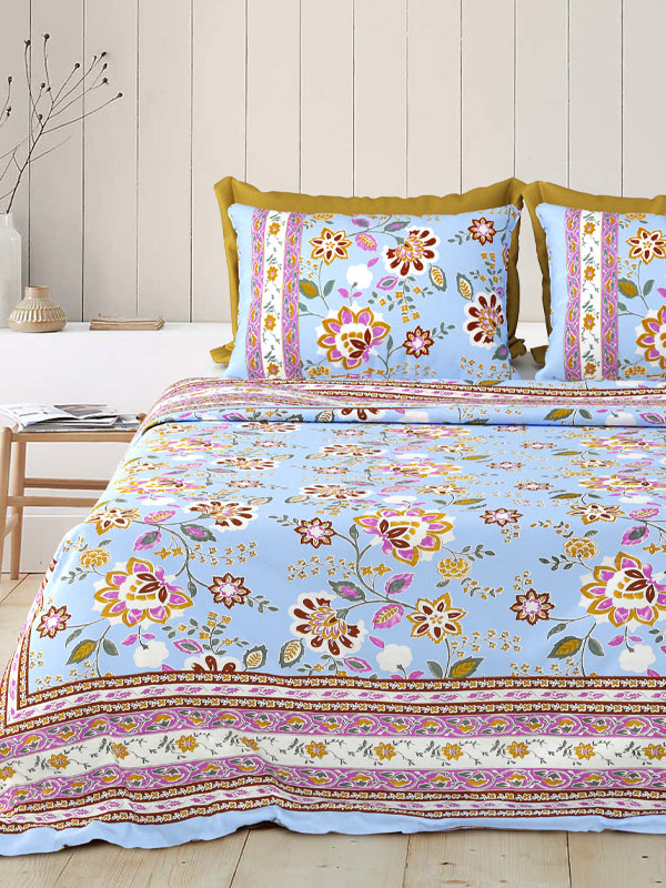 Bring elegance and tradition to your home with this blue base bedsheet featuring orange and green floral prints from the Rangriti Collection. Handcrafted in Jaipur on pure cotton, it offers a soft, breathable feel while showcasing the beauty of screen-printed florals. The soothing blue backdrop paired with vibrant motifs makes it ideal for refreshing your décor.