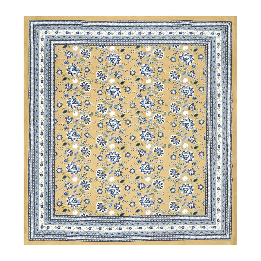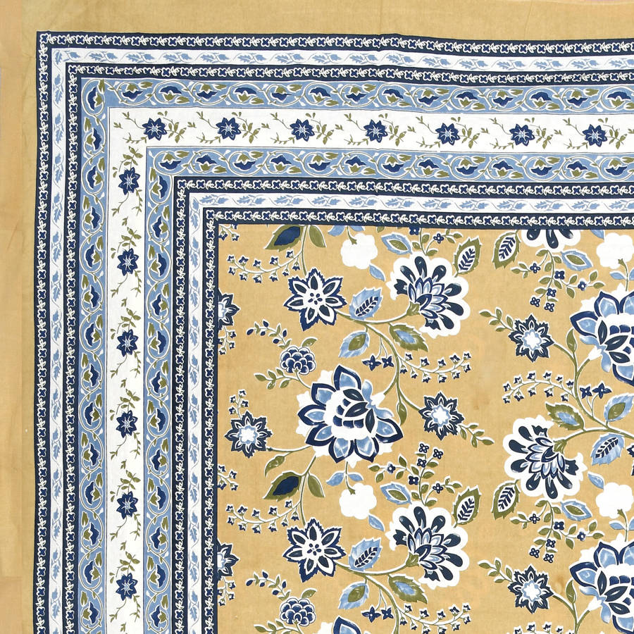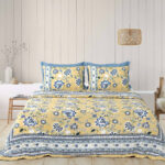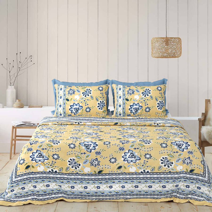 Bright, cheerful, and full of charm, this yellow base bedsheet with blue floral motifs from the Rangriti Collection is a true celebration of color. Crafted in Jaipur by skilled artisans using pure cotton, it blends comfort with cultural artistry. The lively floral detailing against a sunny yellow base makes it perfect for both festive occasions and everyday use.